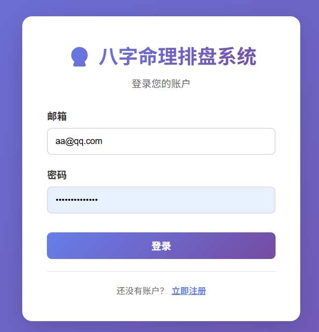 创建一个现代化的、前后端分离的 Web 应用程序,核心功能是根据用户输入的出生日期时间计算并显示八字命盘。系统需支持用户注册、登录,并能保存已登录用户的八字信息。
