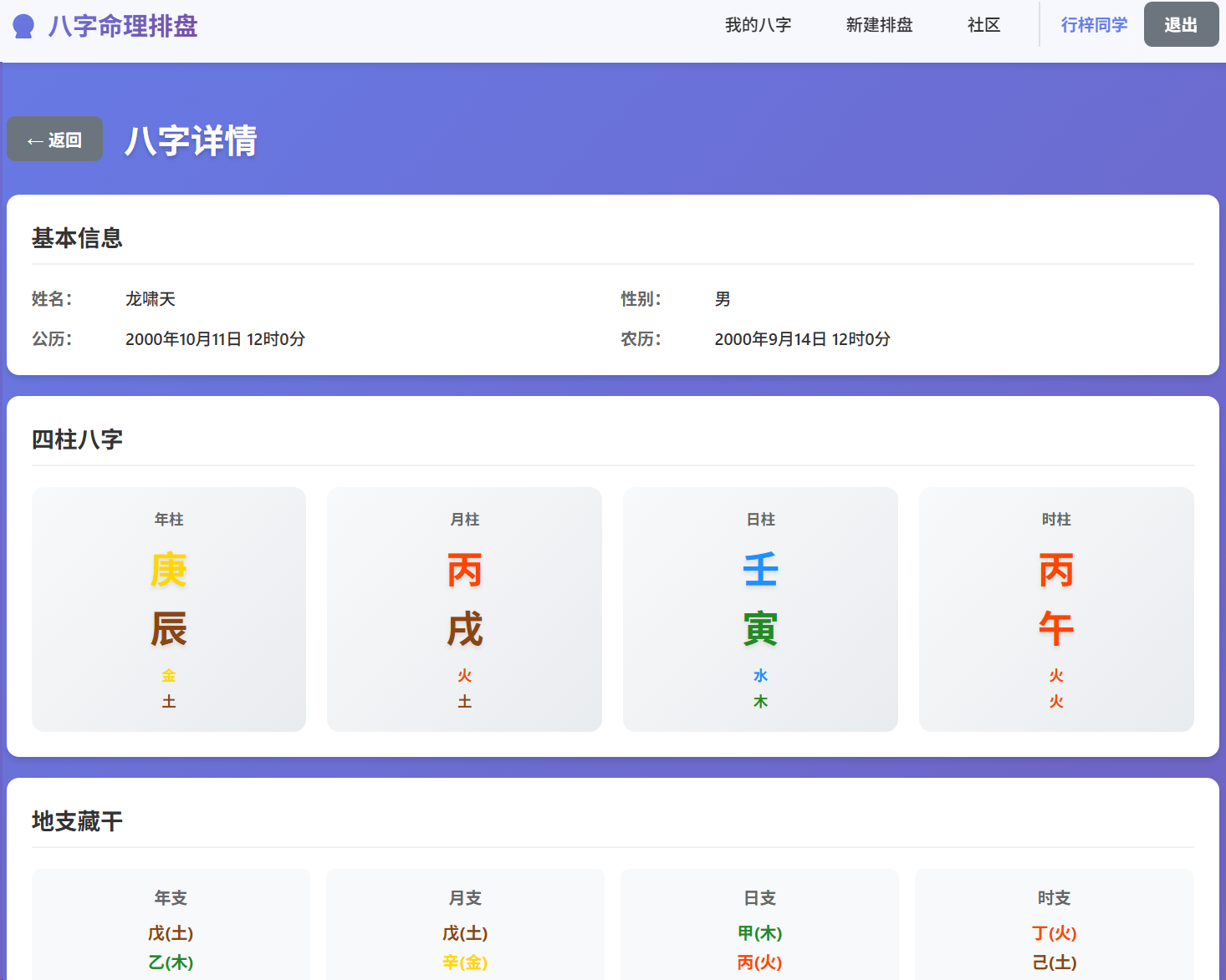 清晰展示计算出的八字结果,包括姓名、型别、时间、四柱、藏干、五行、大运、神煞、起运时间、流年、流月、五行金木水火土用五种颜色显示